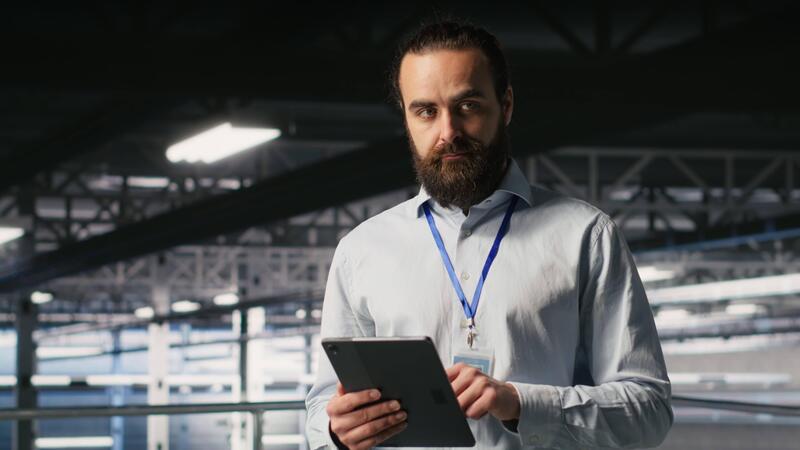 Portrait of smiling engineer in data center monitoring neural network LLM visualization. Cheerful server hub IT specialists overseeing rigs powering machine learning processes, camera B Pro Video