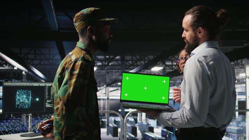 Military command center engineering team using chroma key notebook. Army IT expert and coworkers in data center using green screen laptop to defend networks against threats, camera A Pro Video