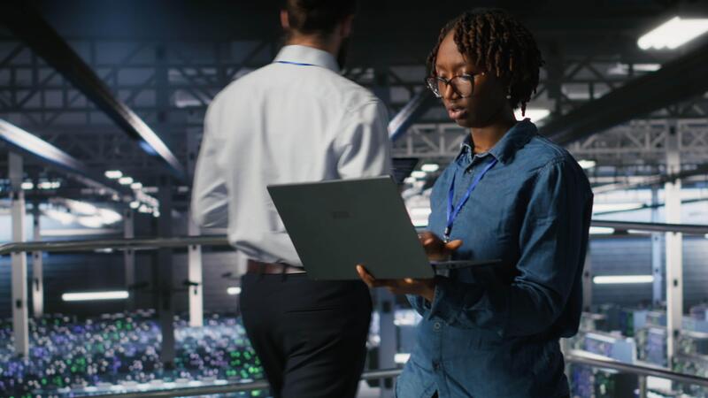Data center engineer walking on industrial platform, running diagnostics on equipment to identify errors. Server farm IT professionals preventing rigs failure to minimize downtime, camera B Pro Video