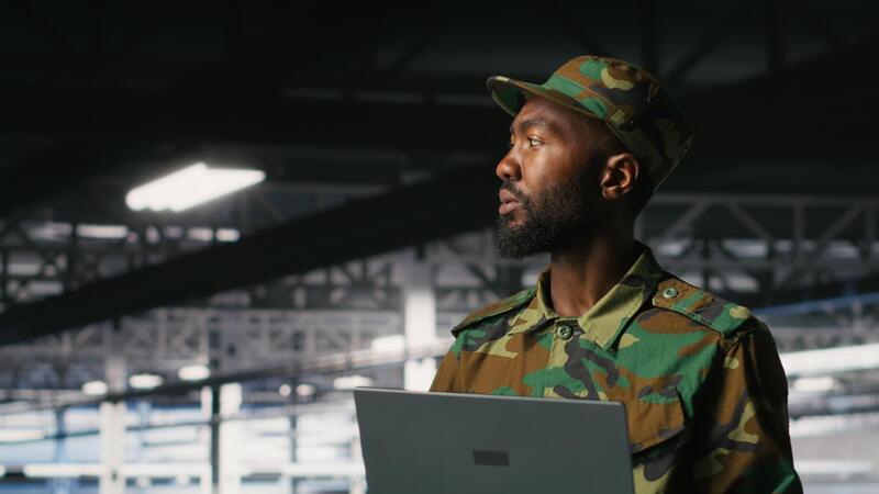Army information technology specialist in data center troubleshooting military computer systems and networks using laptop. Soldier in command center server room using notebook, camera B Pro Video