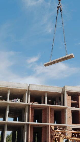 Construction Site with Crane Lifting Concrete Slab. A dynamic view of a construction site where a crane is lifting a concrete slab towards the upper levels of a Pro Video