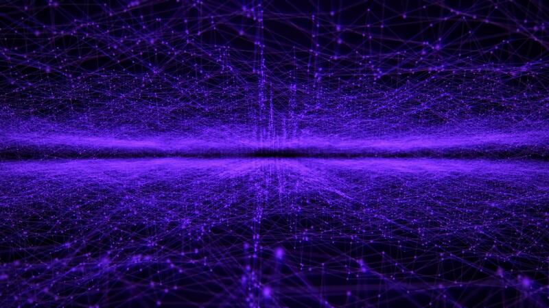 Purple plexus field made of illuminated dots and lines with moving camera and soft glow effect. Dark background for information technology, science and artificial intelligence visualization. 4K 30fps Pro Video