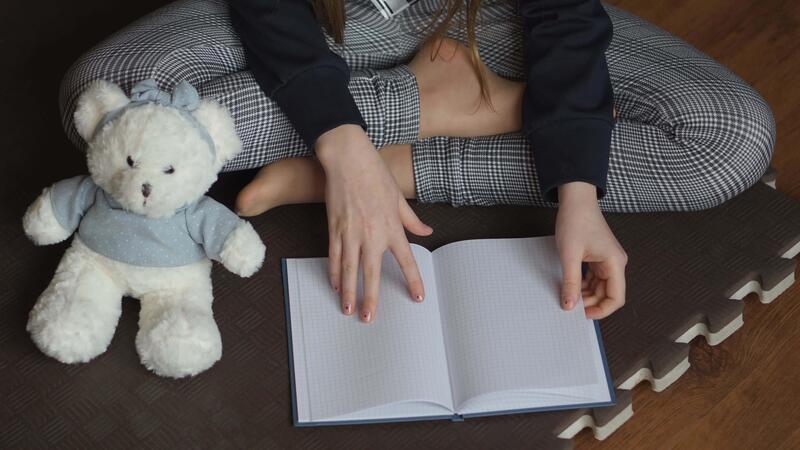 A person sits cross-legged with an open notebook, accompanied by a plush teddy bear. The scene is set on a soft mat, creating a comforting learning atmosphere. Pro Video