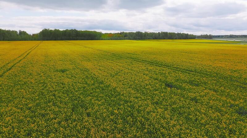 Aerial view of a vast yellow rapeseed field with visible tracks, bordered by green trees under an overcast sky with soft, diffused light. Pro Video