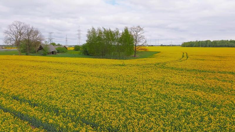 Aerial perspective of a vast rapeseed field with yellow blooms, a tree cluster, power lines, a road, and an overcast sky creating diffused light. Pro Video