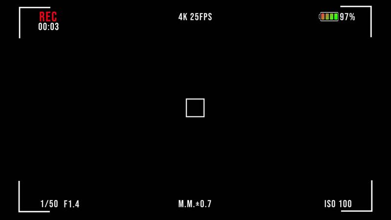 4K Camera Viewfinder Overlay with Minimal UI Elements Like Record Timer, Battery Indicator and Focus Box in a Quiet Recording Interface Pro Video