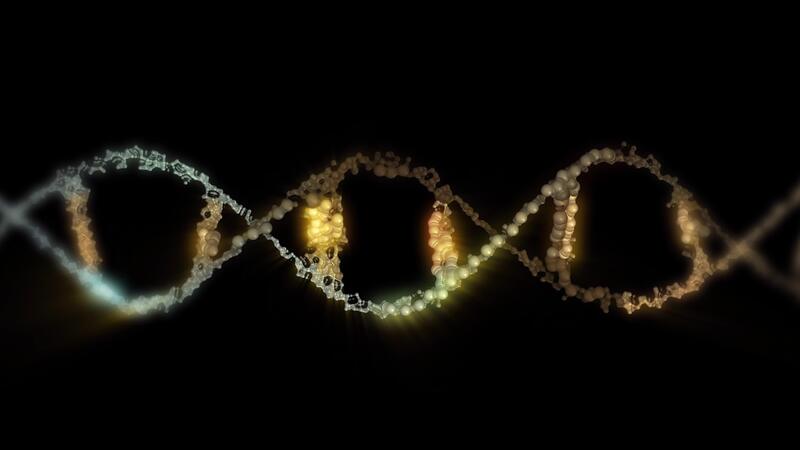 A close-up of the structure of the grey-gold DNA helix, showing its twisted ladder-like structure in looping motion. Pro Video