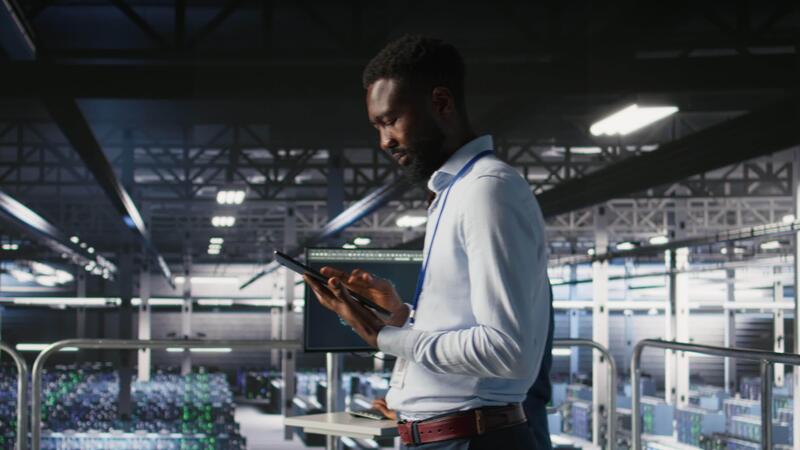 Technician walks in data center, doing maintenance tasks on tablet, ensuring optimal performance. IT expert reviewing diagnostics and applying patches to server hub gear, improving stability, camera A Pro Video