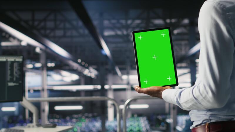 Close up of server hub admin using isolated screen tablet next to colleague reviewing AI LLM visualization. Data center employee using mockup device to monitor machine learning systems, camera B Pro Video