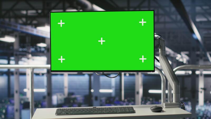Green screen mockup monitor on data center industrial platform displaying hardware status. Chroma key screen tracking servers processing machine learning datasets in industrial environment Pro Video