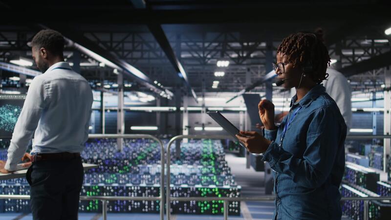 Server room admin using tablet and headset microphone to provide infrastructure tech support. Data center IT specialist resolves backend issues while coordinating with remote teams, camera A Pro Video