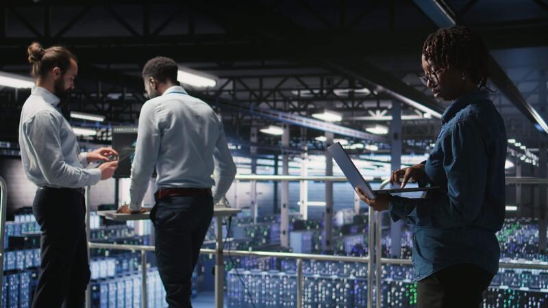 Data center teamworking colleagues running diagnostics on equipment to identify errors, doing brainstorming. Engineering team preventing rigs failure to minimize downtime, camera A Pro Video