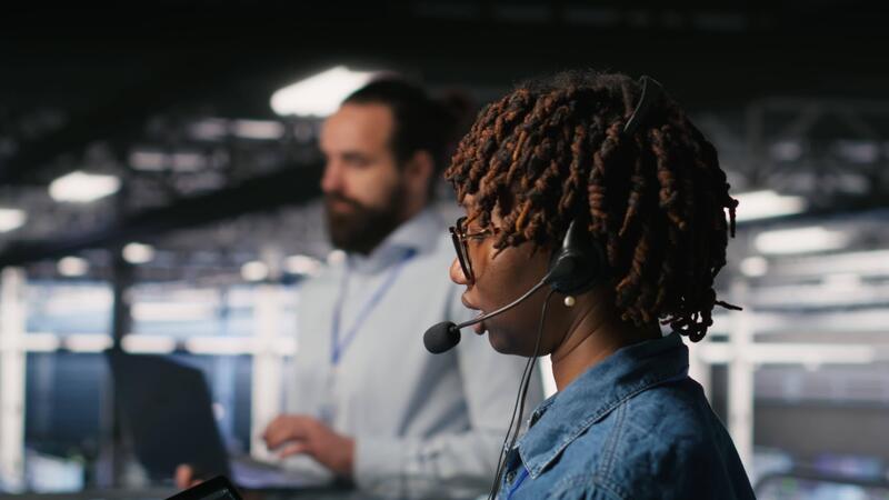 Data center worker on industrial platform speaks in headset microphone while overseeing maintenance on AI rigs below. Admin uses tablet to coordinate deep learning system tasks with team, camera B Pro Video