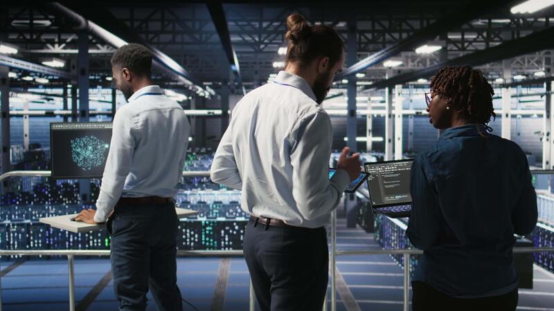 Data center engineering team doing maintenance on servers used for artificial intelligence processing. IT experts manage data center arrays used for machine learning training with tablet, camera A Pro Video