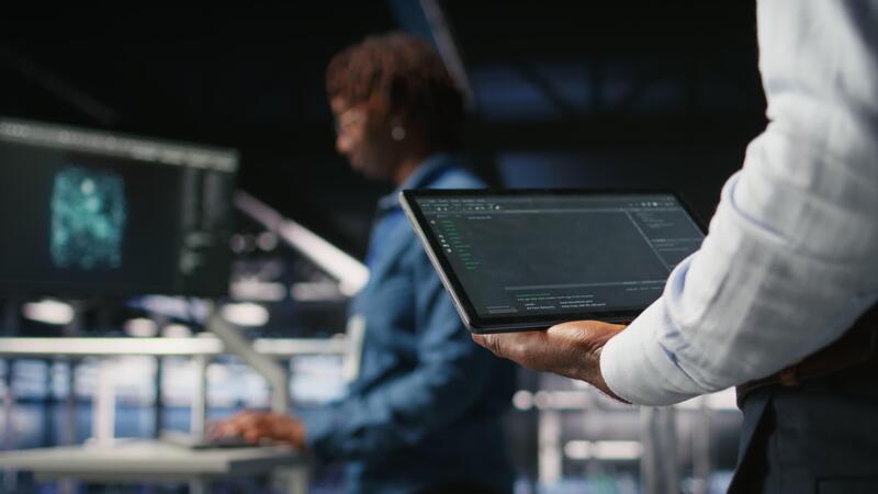 Close up of data center admin using tablet to reviewing machine learning code dashboards. Server farm IT expert using device to monitor AI infrastructure performance, camera A Pro Video