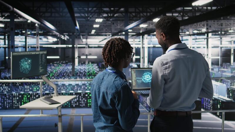 Data center team on industrial platform collaborating to maintain servers using artificial intelligence. Engineers cooperating to support infrastructure AI machine learning automatization, camera A Pro Video