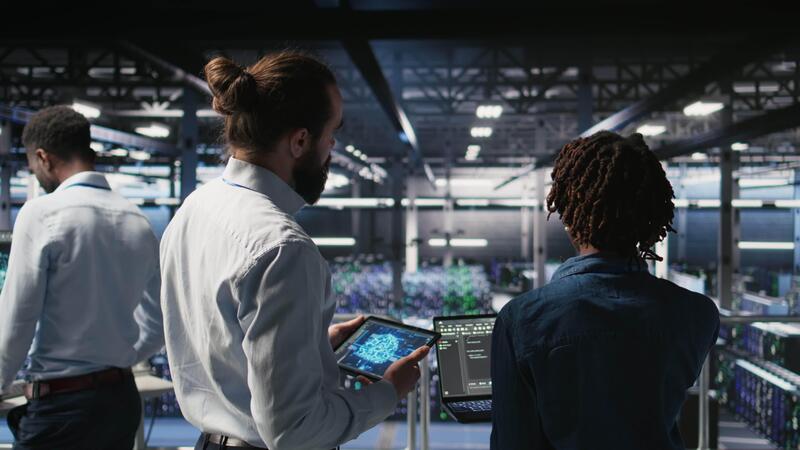 Data center system administrators performing maintenance on supercomputers used for AI. Engineering team managing server hub rigs used for deep learning training, camera A Pro Video