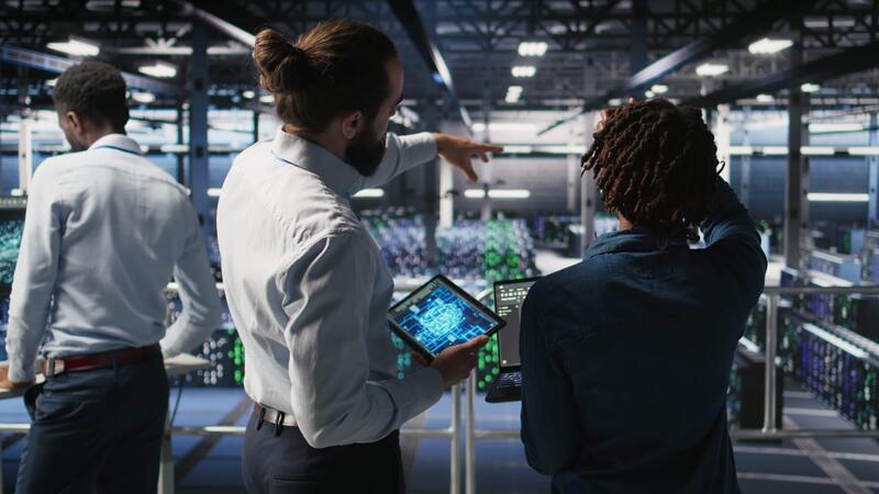 Server farm manager overseeing workers doing infrastructure AI machine learning automatization. Data center team leader supervising employees using artificial intelligence, camera A Pro Video