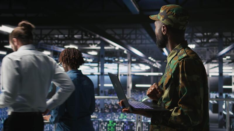 Army IT specialist in data center using laptop to defend networks against cyber threats. Military command center admin using notebook to identify potential intrusions or malicious activities, camera A Pro Video