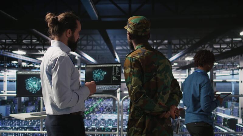Military server room IT professionals using AI LLM tech on laptop to review network performance. Army operators manage hardware systems supporting mission critical connectivity, camera A Pro Video