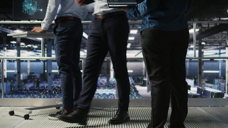Data center system administrators collaborating to maintain servers using artificial intelligence. Teamworking colleagues doing infrastructure AI machine learning automatization, camera A Pro Video