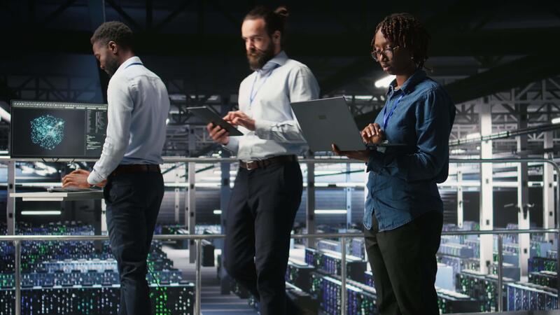 Data center system administrators doing maintenance tasks on laptop, ensuring optimal performance. IT specialists cooperating to review diagnostics and applying patches to server hub gear, camera A Pro Video