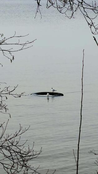 A long-lens, eye-level shot captures two small gulls perched on a dark, round, floating object in calm, grey water, framed by bare tree branches in the foreground. The muted tones and minimalist Pro Video
