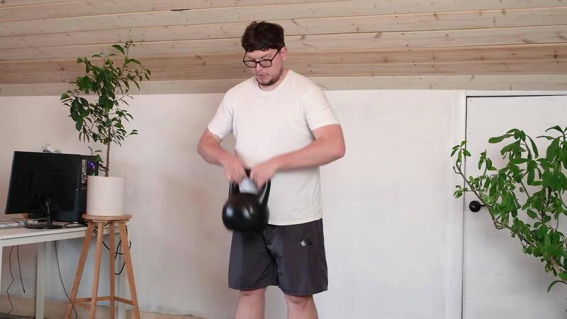 man training with kettlebell at home while working from the computer from home, performing workout between working sessions Pro Video