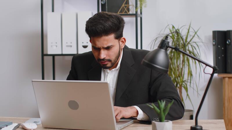 Irritated shocked businessman working on laptop website problem computer virus data loss by hacking Pro Video