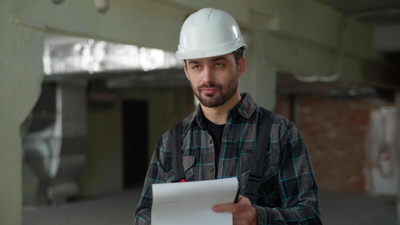Builder architect engineer man inspecting building on construction site repair work problem dissatisfied foreman writing checklist plan Hispanic guy male technician inspector check build project upset Pro Video