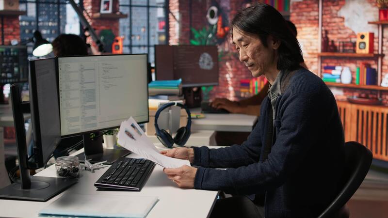 Senior startup HR recruiter identifying candidates for job opening, reviewing CVs to determine qualifications. Headhunter screening engineers for software development position, camera A Pro Video