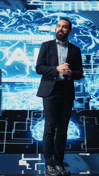 Vertical Technician specialist making AI brain neural networks business pitch at a tech convention, hosting a live conference to discuss about deep learning benefits. Business technology growth. Camera B. Pro Video
