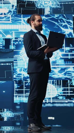 Vertical Engineer studying AI brain for data structures and predictive analytics, highlighting smart technology and deep learning for innovation and productivity. Algorithmic thinking. Camera B. Pro Video