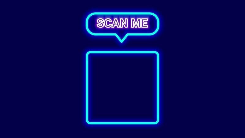 A minimal neon outline of a phone screen with 'Scan Me' indicates an app scan area, linking physical items to digital content easily Free Video