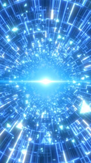 Radiating tunnel of glowing blue circuitry patterns with light shards, evoking futuristic digital portals and high-speed data flow Pro Video