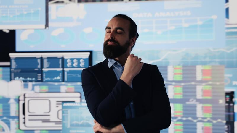 Conceptual image of a businessman in digital environment focused on metrics, strategic planning and profitability through technology. Insightfulness and forecasting activity. Camera A. Pro Video
