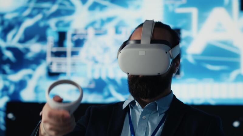 Professional technician uses VR headset and AI brain functions, working on data visualization interface for machine learning algorithms. High tech device for innovation. Camera A. Pro Video