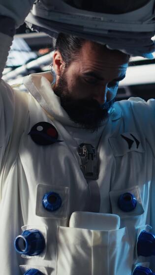 Vertical Astronauts in advanced technology spacecraft working together to update red planet updating flight log during routine mission check. Orbit station crew colleagues looking at system diagnostics Pro Video