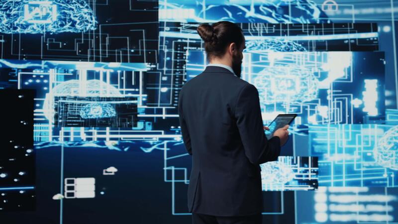 IT specialist interacting with digital AI neural networks for deep learning and algorithmic thinking, ensuring smart tech innovation and future development strategy with science. Camera B. Pro Video
