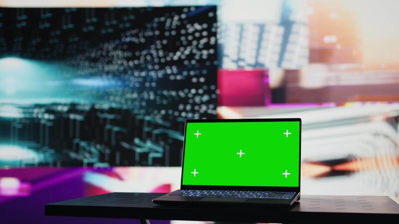Empty scene with a pc showcasing copy space display next to artistic lights, creating a soundscape for nightlife ambiance and music culture. Spreading the visual art vibes and creativity. Camera B. Pro Video
