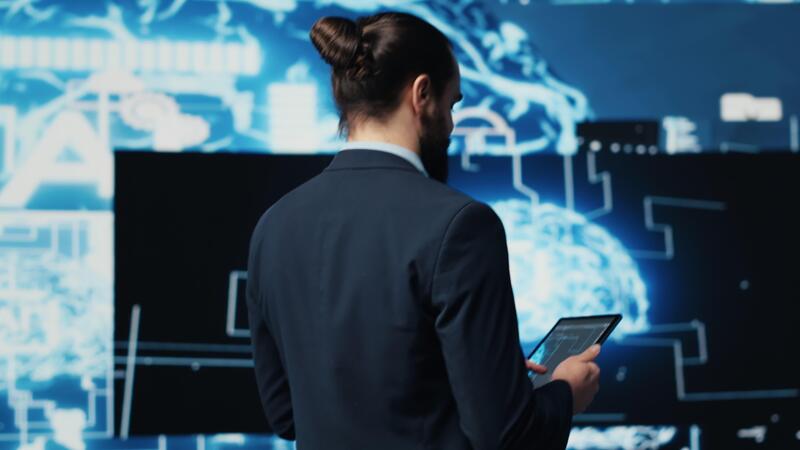 Businessman working with digital AI neural networks system for machine learning high tech innovation and algorithmic thinking. Engineer employs data science for future development strategy. Camera A. Pro Video