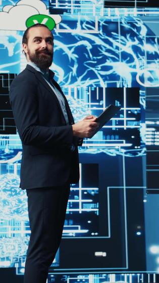 Vertical Entrepreneur uses laptop to review artificial intelligence brain system on dashboard, using high tech data visualization for coding, analytics and deep learning. Strategic growth. Camera B. Pro Video