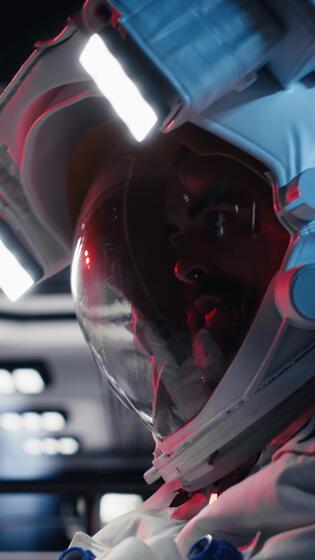 Vertical Astronaut looking at planet visualization before stepping out for scheduled operations outside space station. Cosmonaut in spacecraft powered by advanced engineering landing on planet, camera B Pro Video
