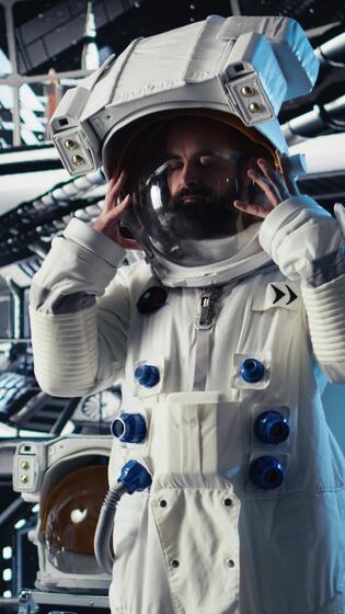 Vertical Jolly astronaut waves hand during videocall with Earth command center, documenting results from space experiments. Cosmonaut salutes ground center team, sharing research observations, camera A Pro Video