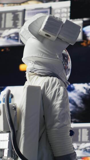 Vertical Curious astronaut standing on a distant planet in space suit and helmet, collecting samples beneath the sky filled with stars. Exploring alien worlds and cosmic frontiers in a space craft. Camera A. Pro Video