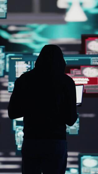 Vertical Professional spy compromising cyber security through malware and viruses, digital threat of hacking with unauthorized intrusion into secure networks. Leading to quantum threat and risk. Camera B. Pro Video