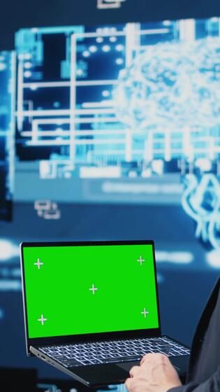 Vertical Professional man ensures artificial intelligence algorithms with mockup screen, working with AI brain system for deep learning. Looks at neural networks data processing. Camera B. Pro Video