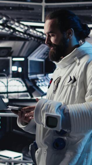 Vertical Team of astronauts in advanced technology spacecraft checking red planet summary analytics during routine mission check. Orbit station crew members using device to look at Mars data Pro Video