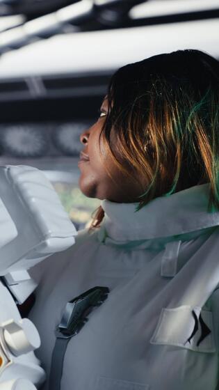 Vertical Laptop in orbit shuttle showing dashboard tracking thermal stability and core performance during orbital flight. Notebook display presenting key spaceship engine readouts analytics Pro Video