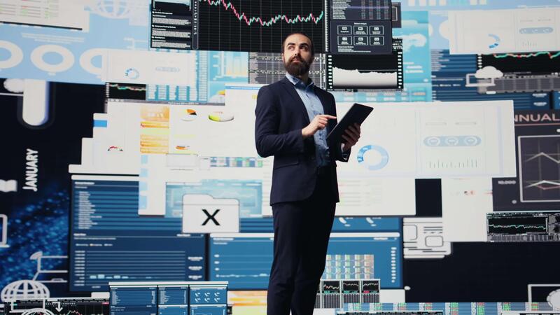 High end executive officer thinking about new powerful ideas for company profit growth, using analytics reports and KPI projections to ensure fruitful decision making. Forecasting. Camera B. Pro Video